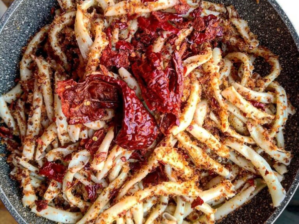 Tritate una manciata di prezzemolo con l’altro spicchio di aglio e rosolatelo in una larga padella con 4 cucchiai di Olio. Unite la metà dei Peperoni Cruschi spezzettati, i Fusilli scolati e fate insaporire per un paio di minuti.